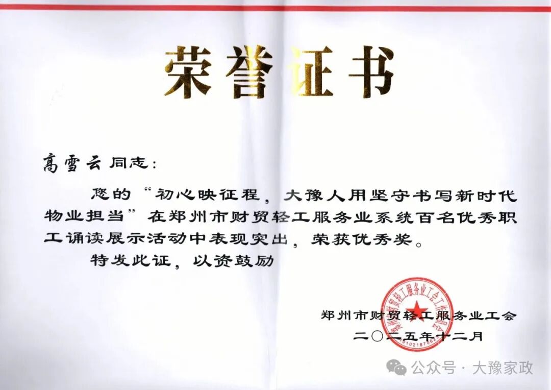 近日,鄭州市財(cái)貿(mào)輕工服務(wù)業(yè)工會(huì)在全系統(tǒng)組織開展百名優(yōu)秀職工誦讀展示活動(dòng),河南大豫家政服務(wù)有限公司高雪云同志憑借扎實(shí)的語言功底與真摯的情感表達(dá),榮獲優(yōu)秀獎(jiǎng)。