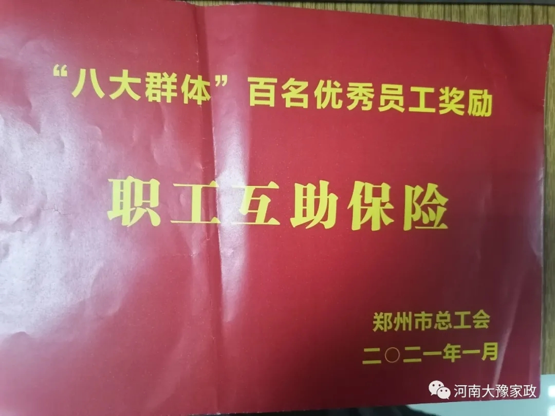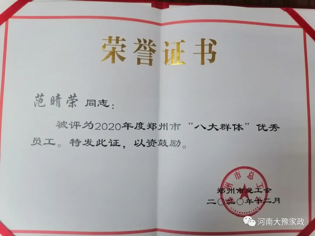 河南大豫家政服務(wù)有限公司優(yōu)秀員工范晴榮被評(píng)為2020年度鄭州市“八大群體”優(yōu)秀員工。