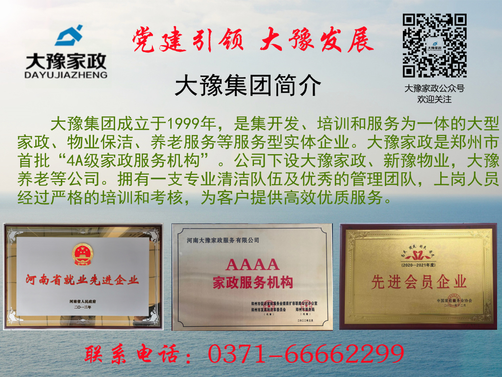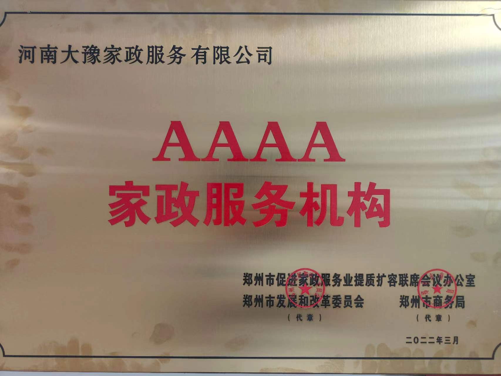河南大豫家政服務(wù)有限公司被鄭州市促進家庭服務(wù)業(yè)提質(zhì)擴容聯(lián)席會議辦公室、鄭州市發(fā)展和改革委員會、鄭州市商務(wù)局評選為鄭州市首批:“AAAA家政服務(wù)機構(gòu)”。