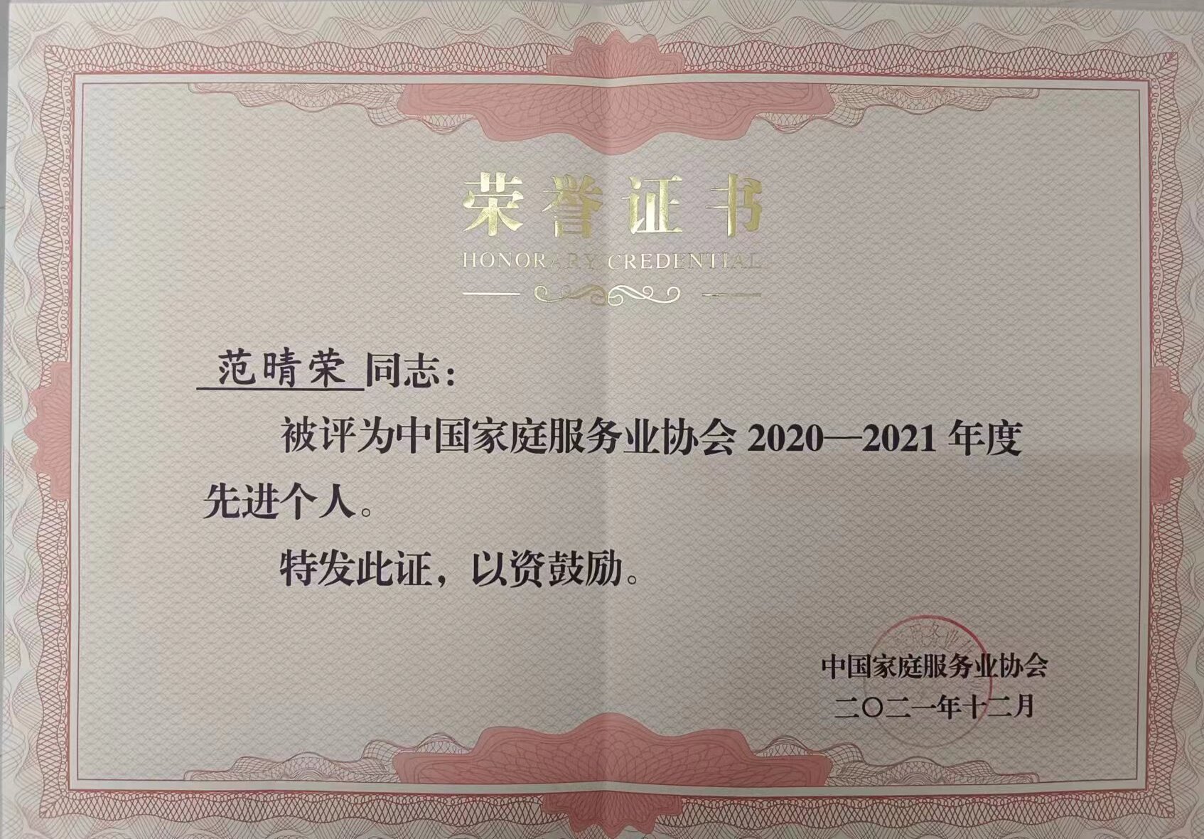 大豫家政員工高雪云、路鳳英、范晴榮被中國家庭服務(wù)業(yè)協(xié)會評為:“中國家庭服務(wù)業(yè)協(xié)會2020-2021年度先進個人”。