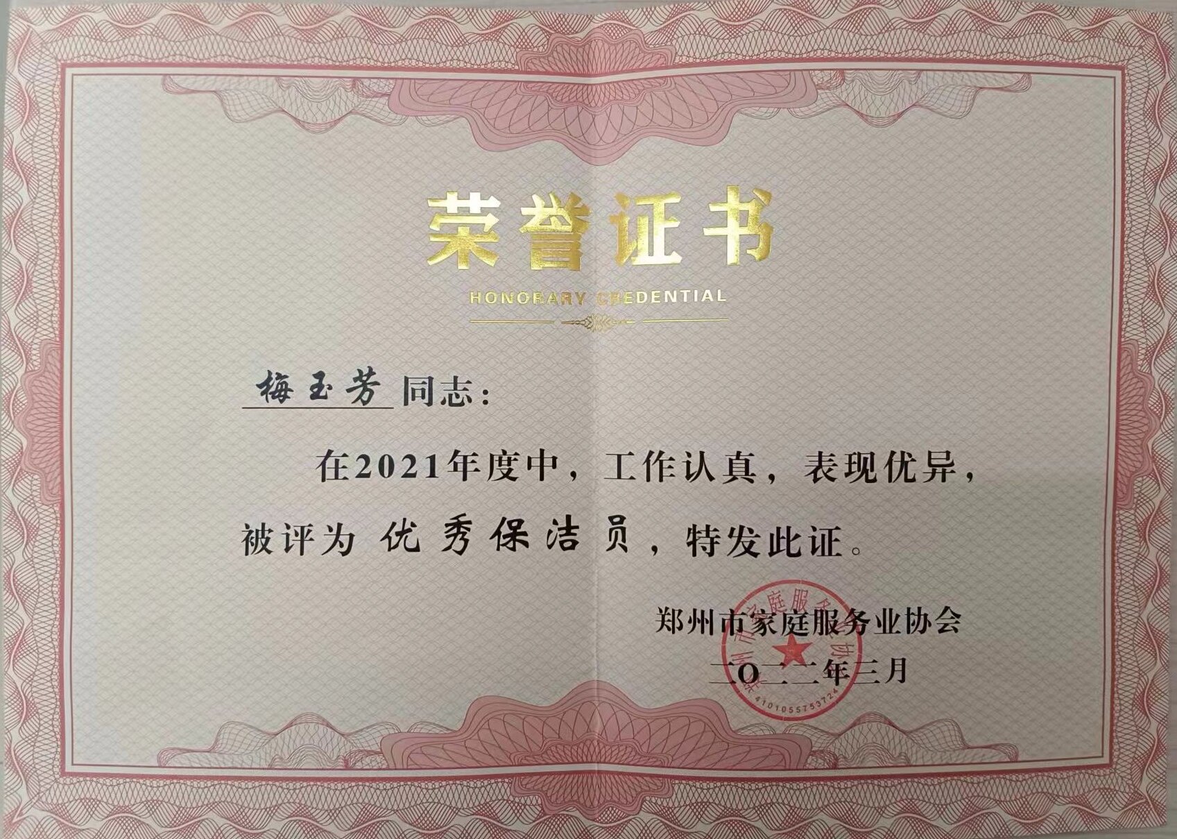 河南大豫家政服務(wù)有限公司員工趙娜娜、黃小云、蘆喜云被鄭州市清洗保潔行業(yè)協(xié)會評為“先進個人”。