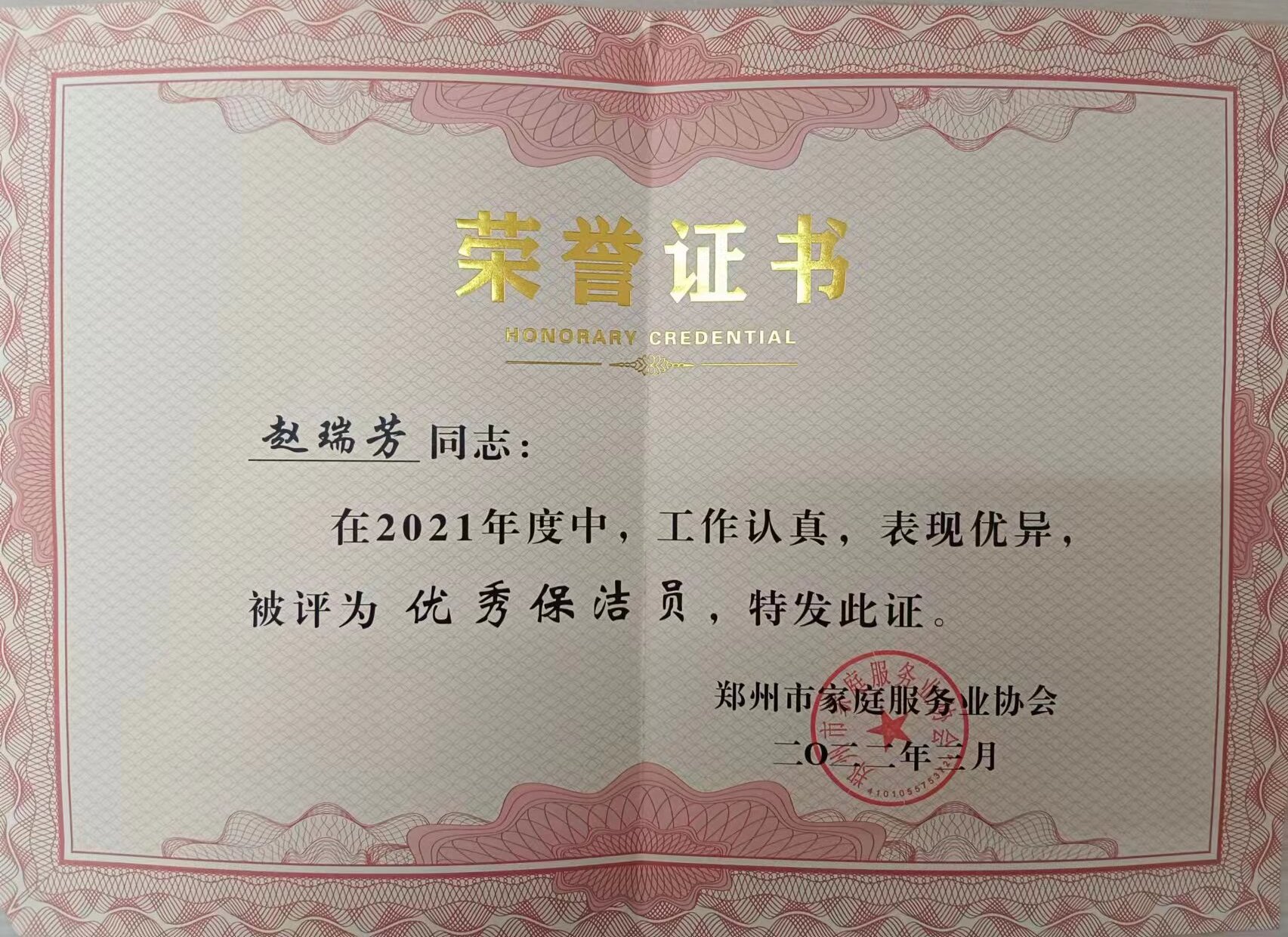 河南大豫家政服務(wù)有限公司員工趙瑞芳、梅玉芳、孟小鳳被鄭州市家庭服務(wù)業(yè)協(xié)會評為“優(yōu)秀保潔員”。