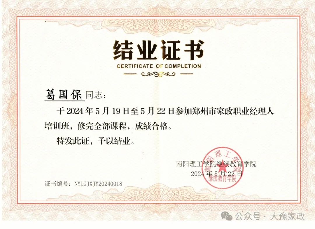 大豫家政公司經理人楊玉利、葛國保參加了此次培訓,積極學習并獲得結業(yè)證書