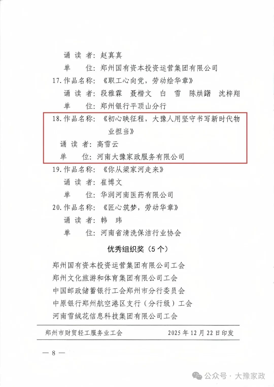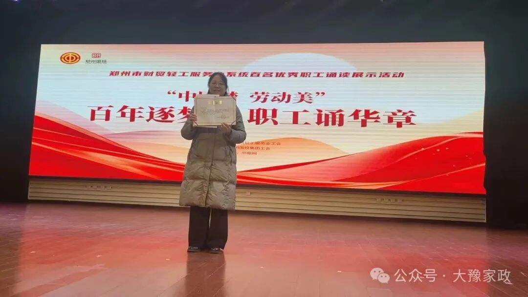 近日,鄭州市財貿輕工服務業(yè)工會在全系統(tǒng)組織開展百名優(yōu)秀職工誦讀展示活動,河南大豫家政服務有限公司高雪云同志憑借扎實的語言功底與真摯的情感表達,榮獲優(yōu)秀獎。